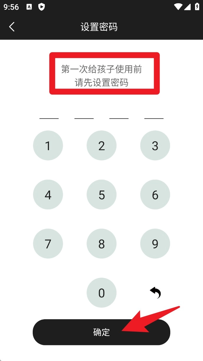 1.首次使用该功能时,系统会弹出密码设置提示,需要输入四位数字,然后点击底部的确定按钮,这组数字将作为孩子使用前的解锁密码。