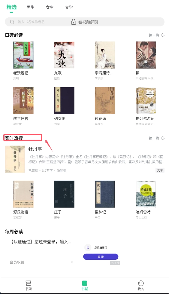 2、浏览时可以多留意板块推荐,实时热搜中的《聊斋志异》以及每周必读里的《水浒传》,都是经过大家验证的优质书籍。直接点击它们的封面,就能立即开启阅读之旅。