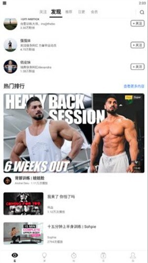 1、启动软件后,点击界面上的“发现”选项,就能浏览当下的热门健身视频排行榜,还可以对热门健身网红进行关注操作。