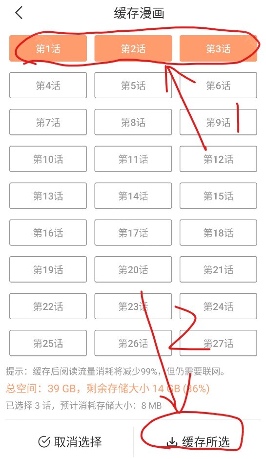 4、解锁操作完成后,点击页面右上角的X按钮,就能进入缓存界面。在该界面中选择你需要缓存的漫画章节,之后点击右下角的“缓存所选”按钮即可。