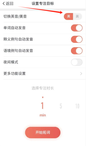 6、英美音切换:在“学习”页面点击“开始”按钮,会弹出英美音切换的相关设置选项。