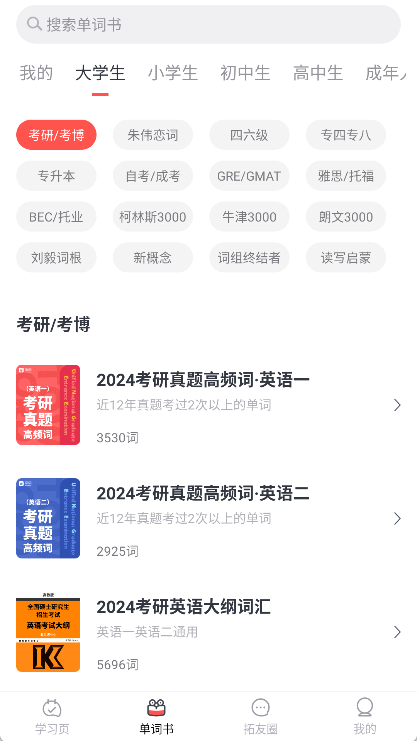 3、查看单词本:在“学习”页面点击词书的封面或者书名,即可查看单词本。