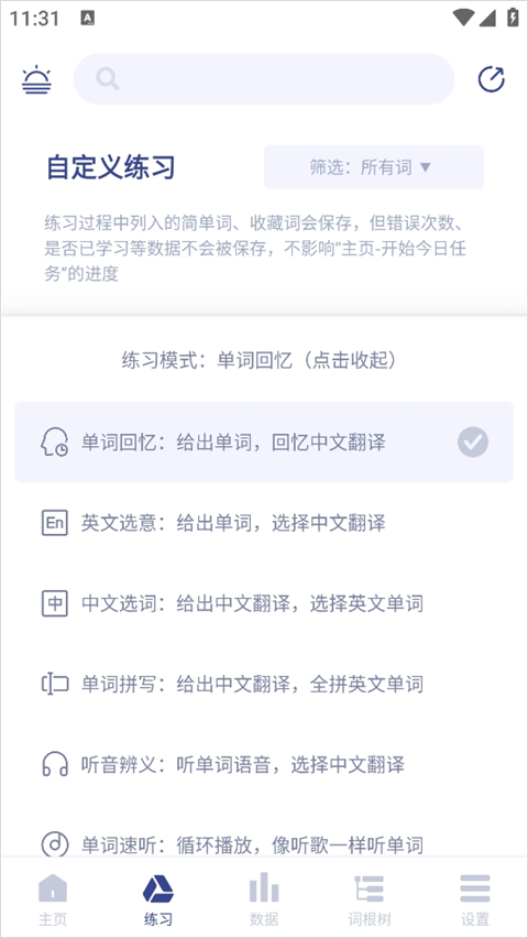6、词汇测试与练习环节,你能清晰看到多个选项,只需从中选择一个,就能完成词汇学习。