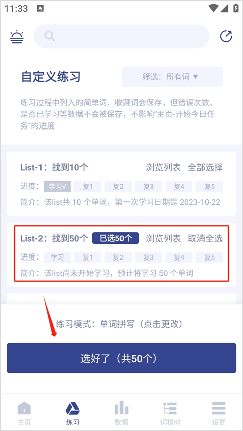 也就是说,在“复习”页面随意选择一种复习模式后,会弹出list列表,这时可以从列表里挑选收藏的单词来展开复习;不过目前自主收藏的单词还没办法进行复习。