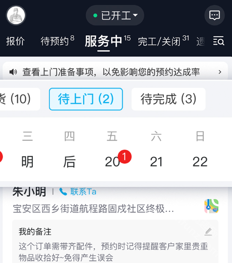 5、服务质量分、服务次数、好评率、预约及时率等多维度服务质量数据将进行全方位展示,助力师傅实现自主经营,不再依赖中介。