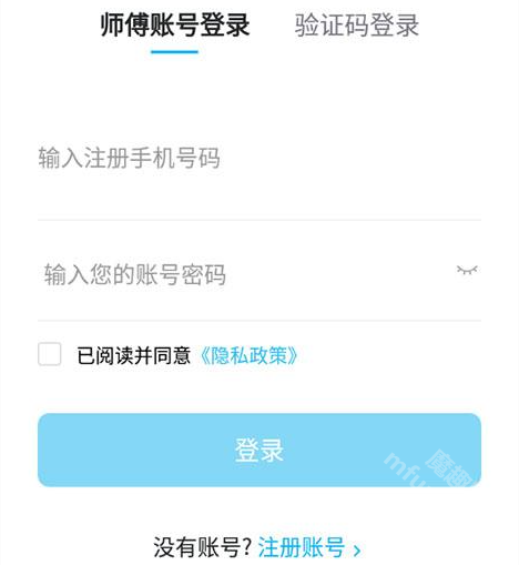 1. 启动万师傅师傅版应用,点击“账号注册”选项,输入手机号与密码信息,随后点击“申请入驻”按钮。