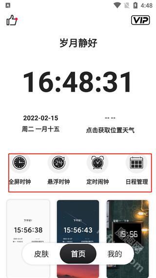 2、点击全屏时钟,这里有丰富多彩的主题可供您挑选,同时还能显示当前位置以及实时天气状况。