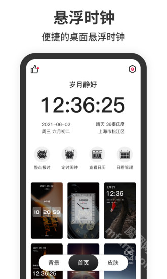 1、打开魔趣网的悬浮时钟App并进入主界面后,您会发现全屏时钟、悬浮时钟、定时闹钟和日程管理等功能都已配备齐全。