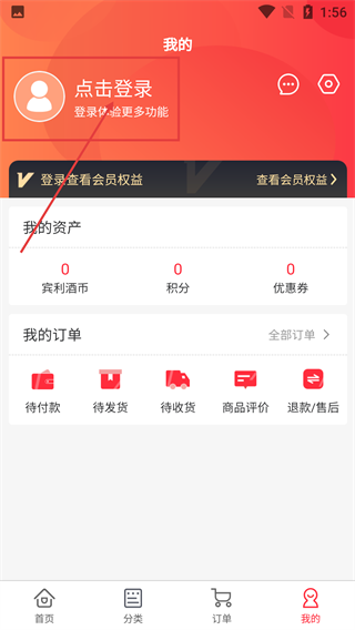 2、进入【我的】界面后,点击【点击登录】按钮即可启动登录流程,该界面同时设有资产、订单等功能模块的入口。