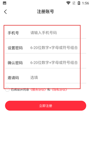 4、进入注册账号界面后,需填写【请输入手机号码】,设置符合规则的【密码】并进行【确认密码】操作,【邀请码】为选填项,完成上述内容后即可提交注册申请。