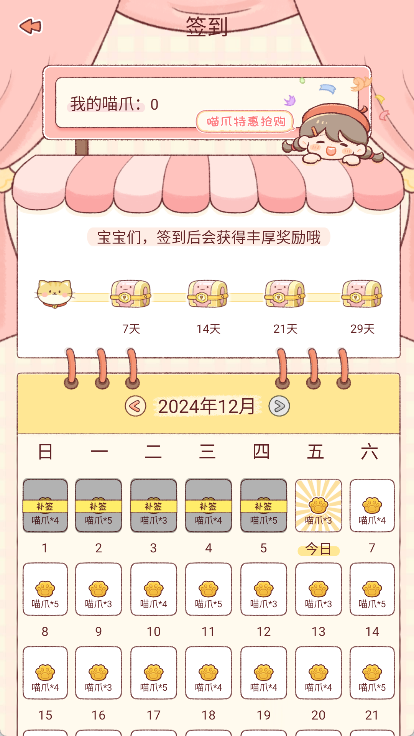 2、在“装扮”页面购买家具,需消耗“猫爪”,该道具可通过签到或充值获取。