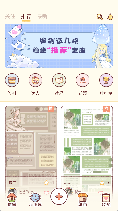 7、在“集市”功能里,你可以找到贴纸、背景等各类素材,用来让手账内容变得更加丰富。
