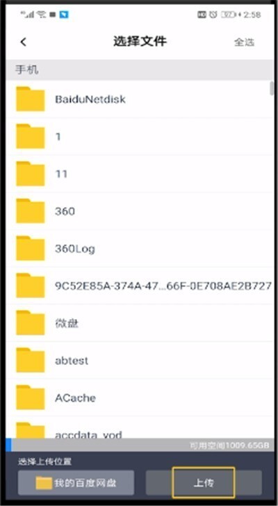 5、选择手机里的文件,点击右下角的上传即可