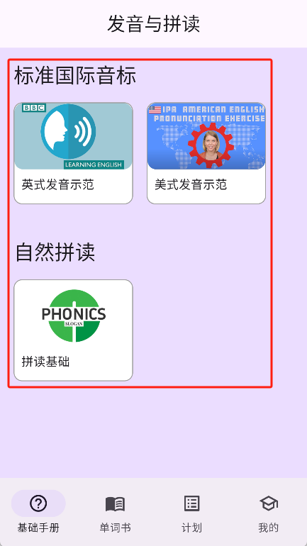 2、接着打开应用,在“基础手册”里能查看最基础的发音示范。