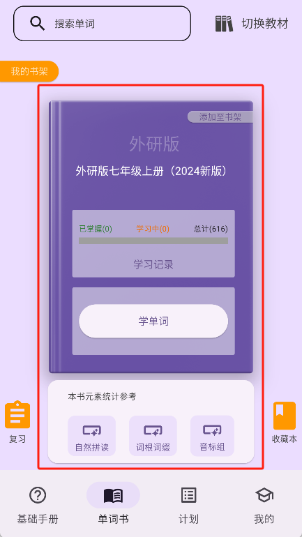 5、选好后点击就能切换单词阶段,接着点击单词书里的“学单词”开始背单词。