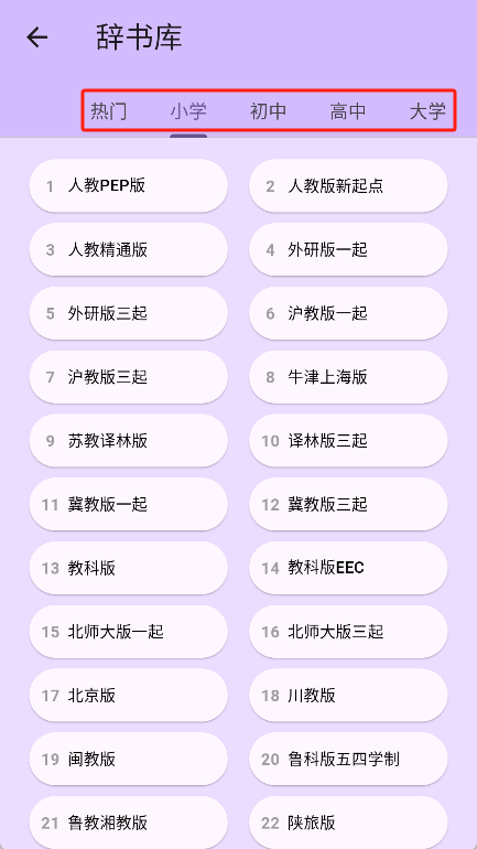 4、点击右上角的“切换教程”按钮,就能选择小学、中学、大学、考研、留学等不同阶段对应的单词内容。