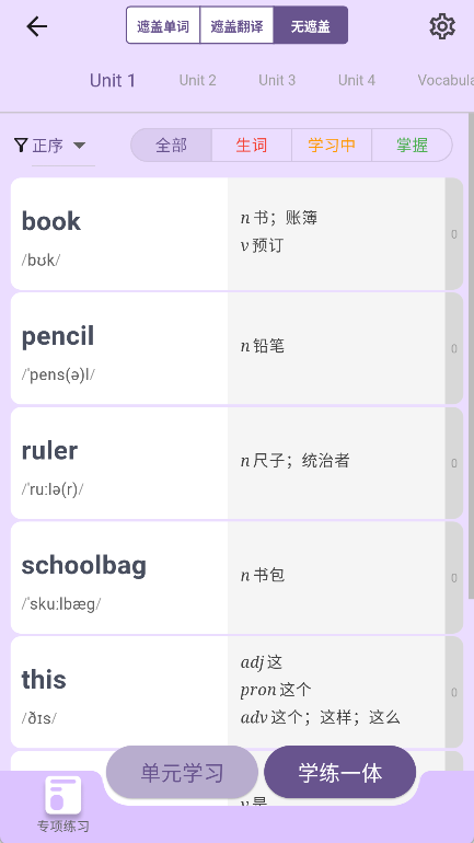 软件拥有同步教材单词的功能,能详细呈现书本里单词的自然拼读、词根词缀、音标等内容,方便用户学习参考。