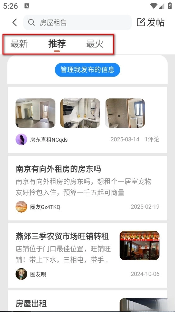 2、可以选择最新、推荐或最火的帖子