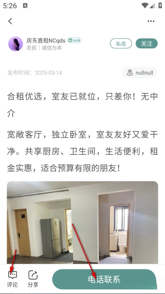 3、挑选合适的帖子进入,接着点击下方的电话联系按钮或者进行评论留言