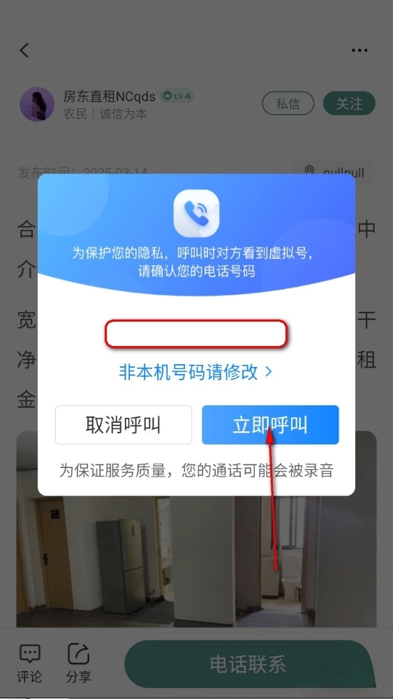 4、点击电话联系可以一键呼叫房东,了解房源