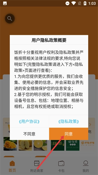 1、在饭折的《用户隐私政策概要》弹窗里,仔细阅读信息收集和授权相关规则后,点击“同意”按钮,即可进入应用的首页界面。