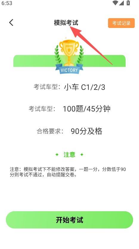 3、进入模拟考试页面,点击开始考试进行答题。