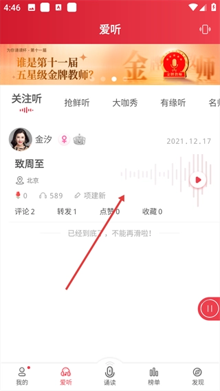1、点击底部的“爱听”选项,进入爱听页面。