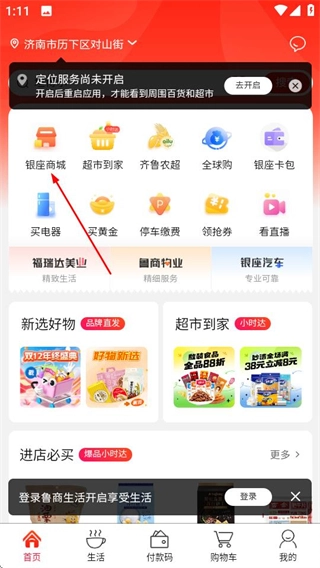 1、在鲁商生活首页,找到并点击银座商城选项,即可进入银座商城页面。
