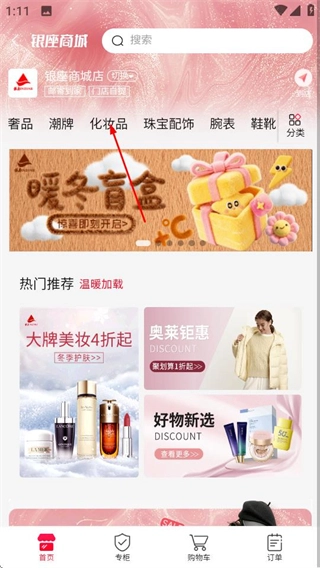 在商城页面,点击化妆品分类,即可进入化妆品子分类页面。