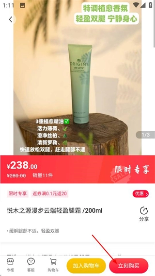4、在列表页,选择悦木之源腿霜,进入商品详情页。