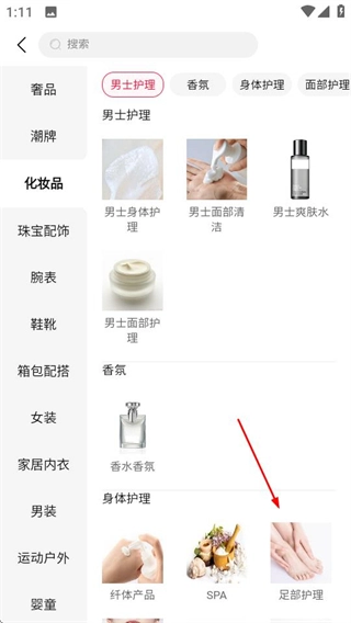 3、在子分类页面,选择身体护理类目,进入对应的商品列表页面。