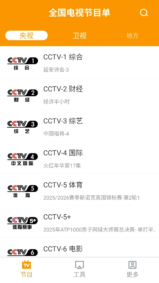 1、打开后,在主界面里,能够选择央视栏目、卫视以及各地方台进行播放。