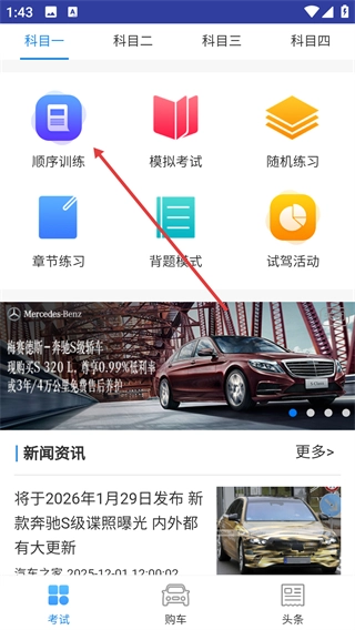 1、在考试页面找到并选择【顺序训练】功能,进入科目一的题目练习环节,就能按照题目顺序开展试题练习。