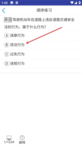2、在顺序练习的单选题里,选择【违法行为】这个选项,完成该题的答案选择步骤。