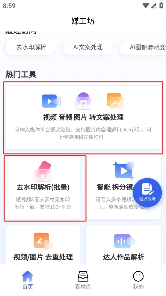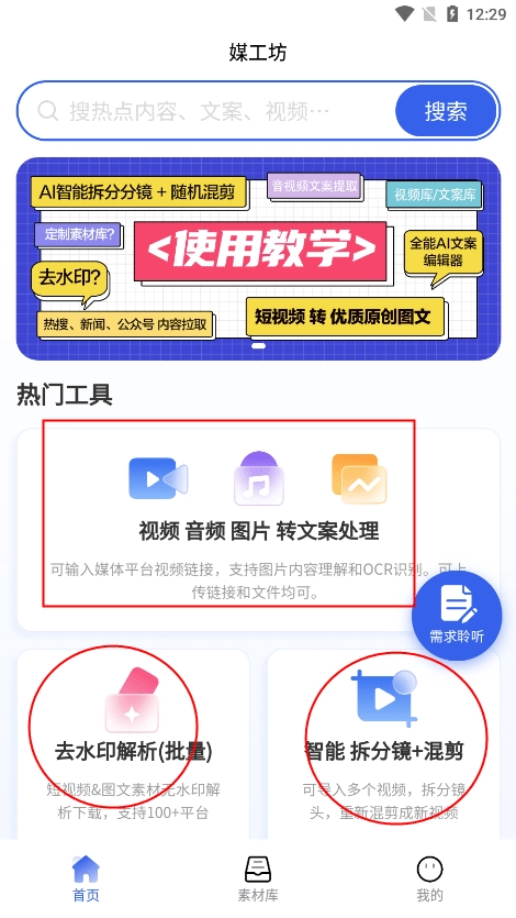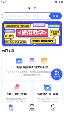 1. 打开媒工坊App后,您会看到“热门工具”“素材库”“我的”等多个功能板块。