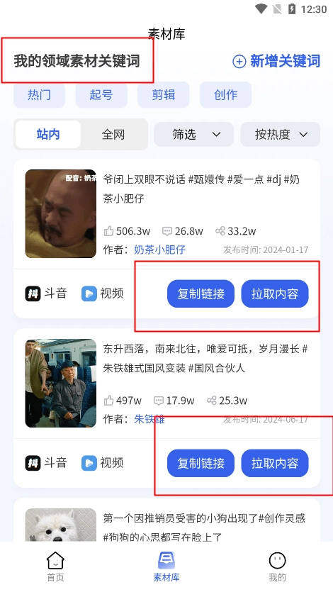 2. 在“素材库”板块,您可以浏览并获取全网各类素材,同时支持链接复制及内容提取。
