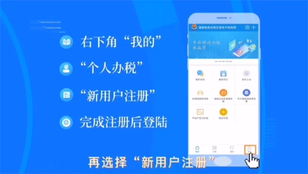 2、接着点击右下角的“我的”,进入后选择“个人办税”,再点击“新用户注册”,完成注册流程后进行登录操作。