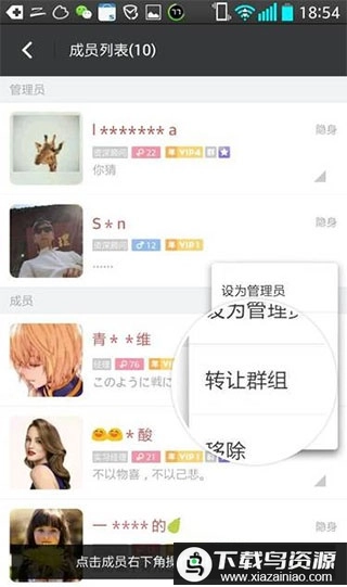2、在成员列表中找到想转让的对象,点击其右侧的操作图标。