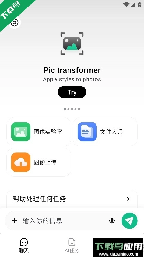 1、进入应用主聊天页面,可以浏览并使用各类功能;
