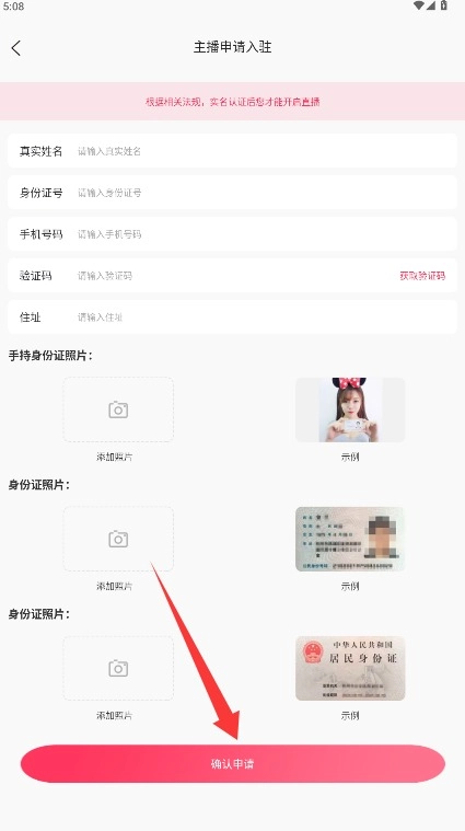 3、进入主播申请页面填写个人资料信息,上传身份证照片后确认提交审核申请。