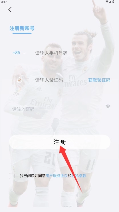 1、在注册页面填写手机号码与验证码,设置好密码并勾选同意相关协议,随后点击注册按钮。