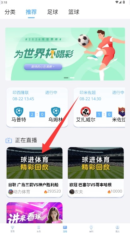 3、在直播界面中选择正在直播的赛事或节目,点击对应内容即可进入直播间。