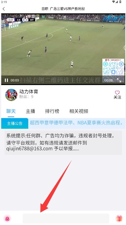 4、进入直播画面后,可实时观看赛事,并可通过底部输入框发表评论参与互动。