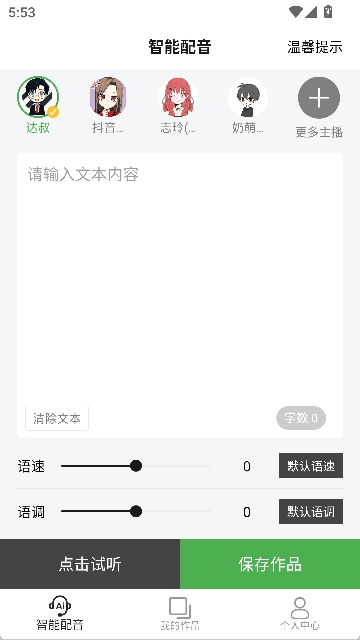 在主播页面能够试听各类声音效果,可依据使用场景挑选男声、女声或者童声主播。