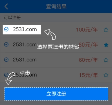 淘域名时,选好对应的条件,就能淘入心仪的域名地址了。