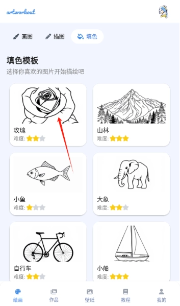 2、界面最上方设有画图、描图、填色三个选项,我们先点击选择填色功能,接着在下方展示的填色模板里挑选一张自己感兴趣的图片。