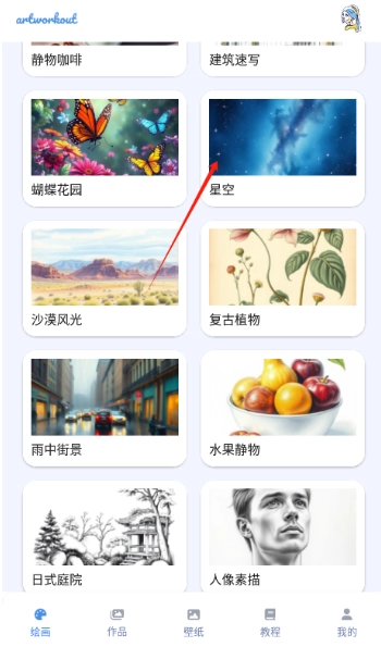 1、打开并进入软件,找到【绘画】板块,挑选自己感兴趣的画作类型,点击进入该类别页面。