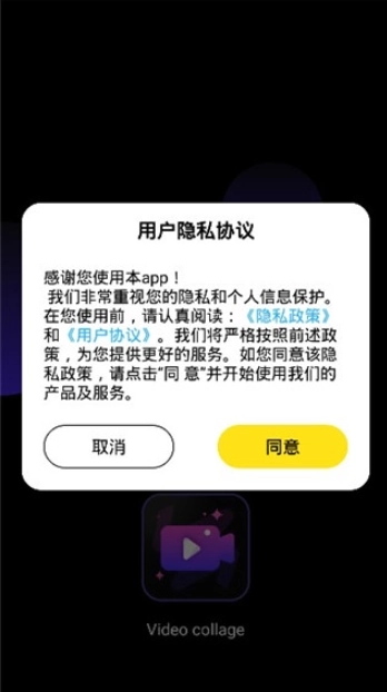 1、第一步是启动Video Collage视频合成软件,仔细阅读用户隐私协议后点击同意按钮;