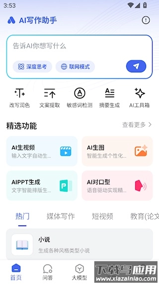 1、进入应用首页后,能看到清晰的功能分区,其中涵盖了核心写作模块以及各类快捷入口