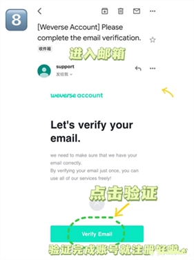 8、打开自己的邮箱会收到验证邮件,点击“Verify Email”按钮即可完成验证,此时Weverse账号注册就全部完成了,返回登录界面就能登录账号啦